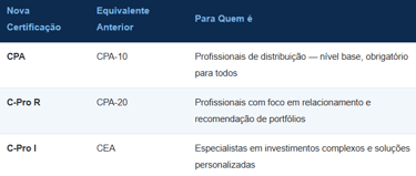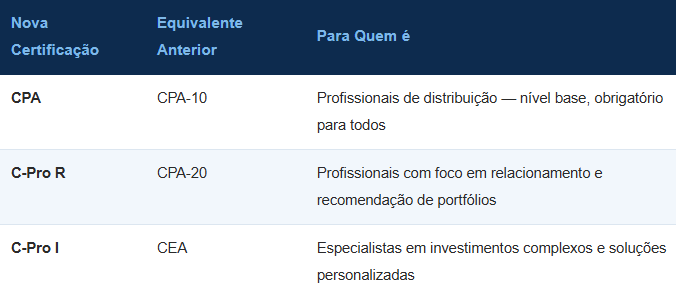 A partir de janeiro de 2026, as antigas CPA-10, CPA-20 e CEA foram extintas e substituídas por três novas certificações, organizadas por tipo de atividade — não mais por nível de complexidade dos produtos: